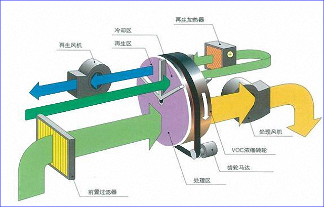 • 含有VOC的被处理空气通过过滤器后,送到浓缩转轮的处理区。在处理区VOC被吸附除去,被净 化的空气从处理区间排出